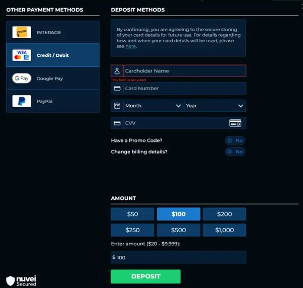 Nous gardons les opérations bancaires locales et simples pour les joueurs de l’Ontario, avec des transactions uniquement en CAD et des méthodes familières. Les dépôts sont disponibles via Interac e-Transfer, iDebit, Instadebit, Visa et Mastercard. Pour Interac e-Transfer, iDebit et Instadebit, les limites de dépôt vont de 10 à 9 999 CAD et le délai est instantané. Les dépôts Visa et Mastercard sont également instantanés, avec des limites de 10 à 3 000 CAD.
